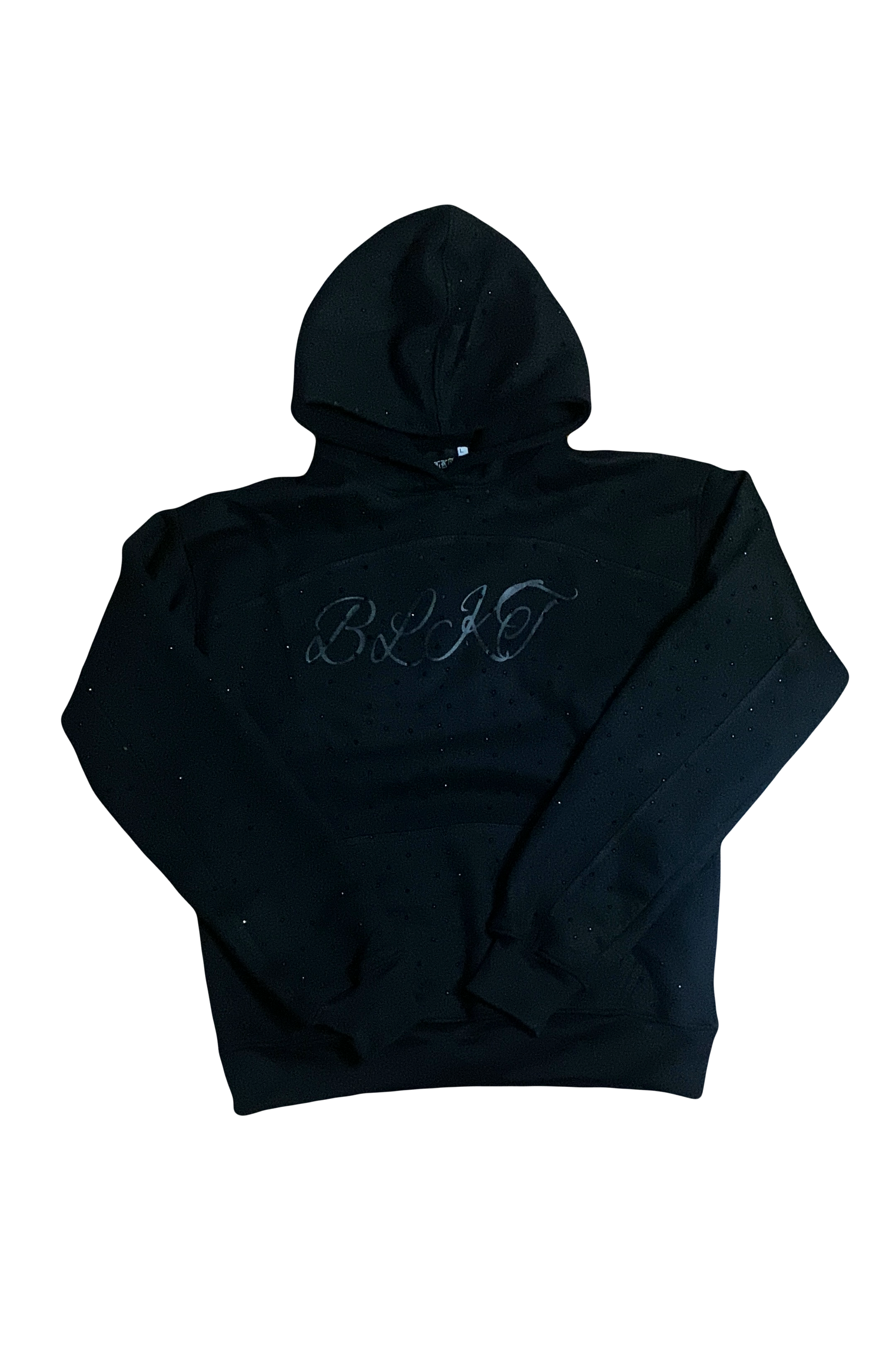 Sudadera negra confeccionada con tejido de alto gramaje, diseñada para ofrecer una estructura firme, cómoda y duradera. Su acabado incorpora pedrería negra aplicada con precisión, aportando un brillo sutil y elegante que se integra de forma natural en la prenda, sin excesos.